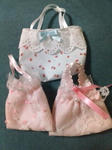向かって右のピンクの巾着型がDD用のバッグになります。絞りは縫いつけなので、引っ張らないように…。