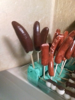 チョコはボンド・ニス・アクリルカラーとホイップ粘土を使用。二回に分けて作ったら、チョコの種類が2種類っぽくなってしまった・・・。