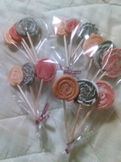 ★ペロペロキャンデー・・・飴ちゃん部分は前にチョコを使って失敗したハーティクレイです。混色を活かして「マーブル」を表現してみました。いちご・オレンジ・チョコ味の三種類入り。でもやっぱりニスを吸収してしまうのでツヤが出ず、特価になりました。